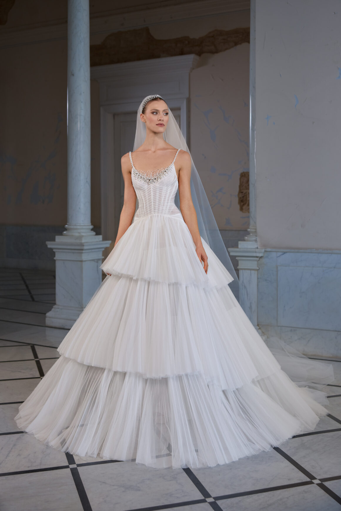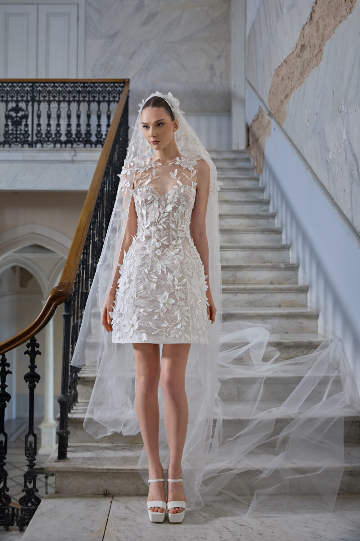 اختارت الدار لوحة ألوان هادئة تنبض بالنعومة، وتنوّعت بين الأبيض الكلاسيكي، الكريمي، والبيج. أما الفساتين، فزُيّنت بتطريزات دقيقة بألوان الأبيض والبلايتن، ما أضفى لمسة من النقاء والرومانسية على كل قطعة. وقد تنوّعت التصاميم بين الفساتين القصيرة المفعمة بالحيوية، والفساتين ذات الطبقات المتعددة التي تضيف جرأة وحركة، إلى جانب تصاميم مبتكرة أعادت صياغة مفهوم فستان الزفاف التقليدي بأسلوب معاصر ينبض بالفن والجمال.