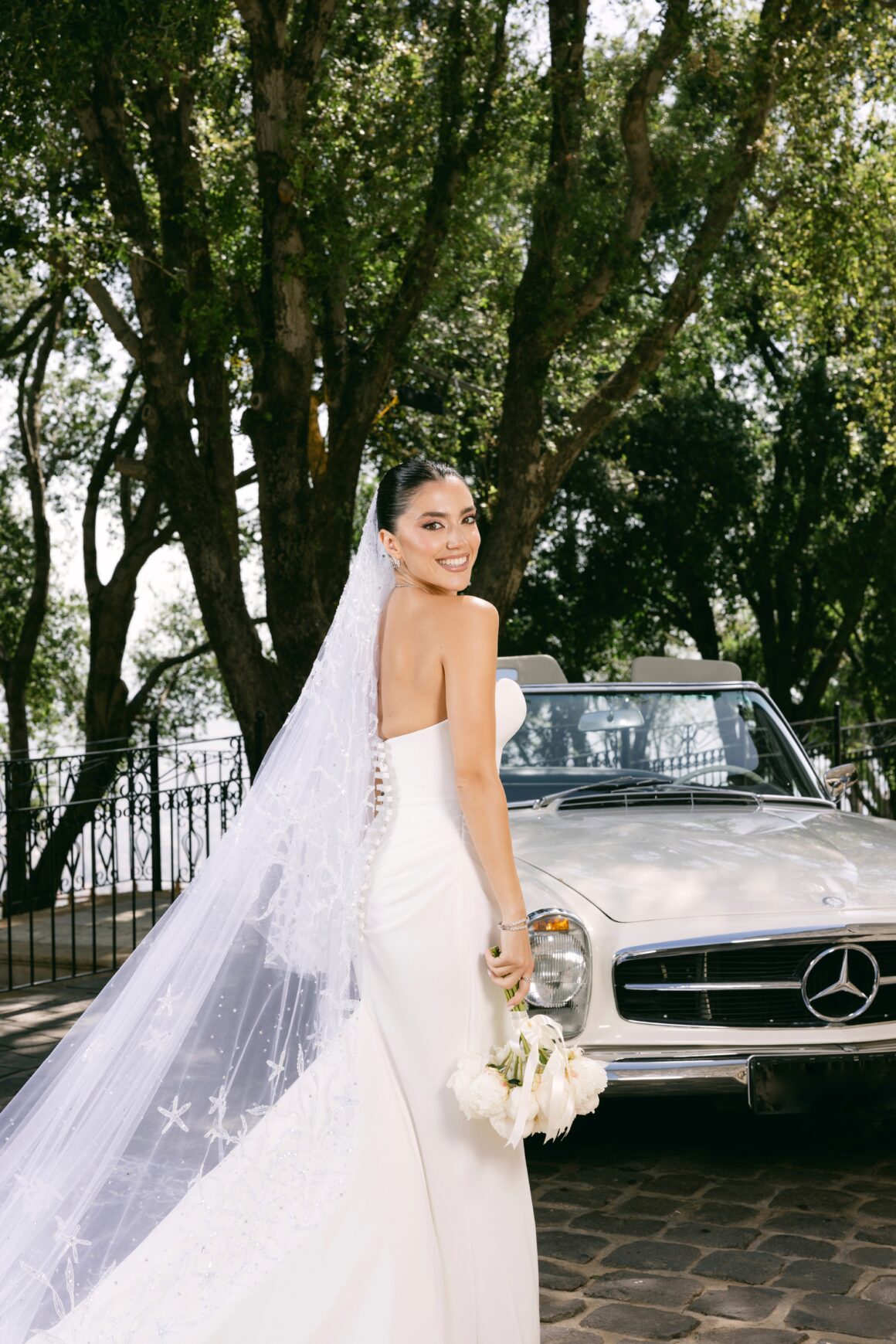 ولأنّ للبحر مساحة خاصة في حياتها، لم تكتفِ ستيفاني بتلميحات بسيطة، بل جعلت من الطرحة عنصرًا سرديًّا قائمًا بحد ذاته. كريستالات زرقاء وبيضاء مطرّزة يدويًا، على هيئة نجمات بحر صغيرة، امتدّت برشاقة على قماش الطرحة، لتجعل من كل خطوة تخطوها العروس، انعكاسًا لرحلة غوصٍ مليئة بالذكريات، وكأنها تستحضر المحيط في تفاصيل يومها الكبير.