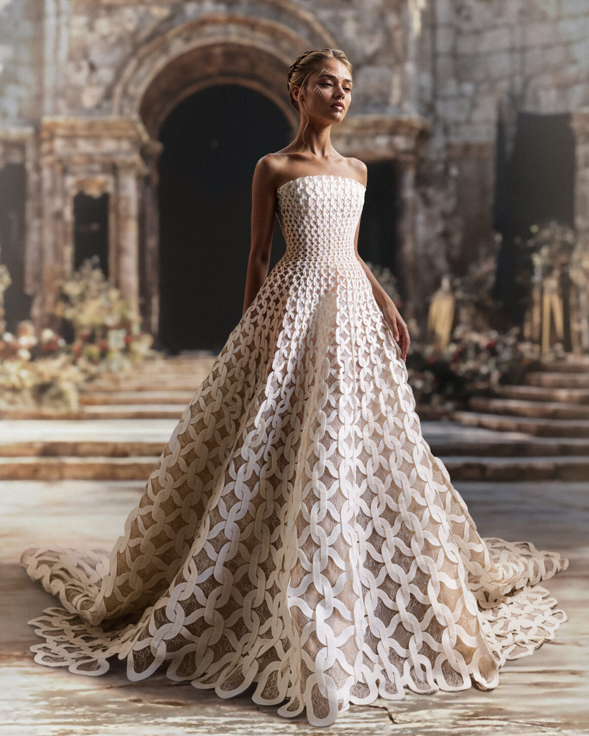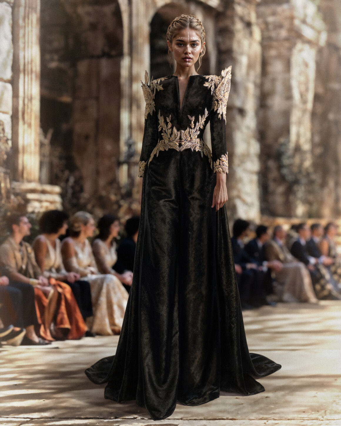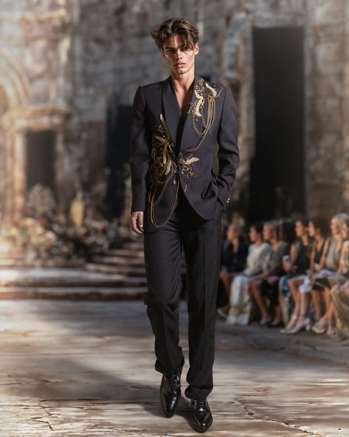 ولأن المجموعة مستوحاة من روح المحاربة المعاصرة التي تقوم على خياطة دقيقة، مرتكزة على منظور أنثوي متميز، فإن كل قطعة مطرزة يدوياً بتفاصيل دقيقة، يعطي بعضها انطباع “الفسيفساء”، وتُضاء أخرى بتطريز الخرز المتناسق فوق الـ”ساتان”، وتلمع فيها خيوط حرير معدنية، وتزداد توهجاً بأحجار لامعة منفذة بدقة وحرفية، تؤكد هوية الدار ومعاييره في الأزياء الراقية. تلتقي ألوان القوة مع الدفء في التصاميم التي تنوعت ألوانها بين الألوان القاتمة، والدافئة مثل الشمبانيا، والأبيض المائل إلى الإصفرار، والأسود القاتم، والرمادي الداكن، والعنابي، والأخضر الداكن، والذهبي، والفضي، والبرونزي المعدني، والأزرق بدرجات متعددة. تعزز هذه الألوان تركيز المجموعة على التباين بين القوة والنعومة، والحضور والانسيابية.