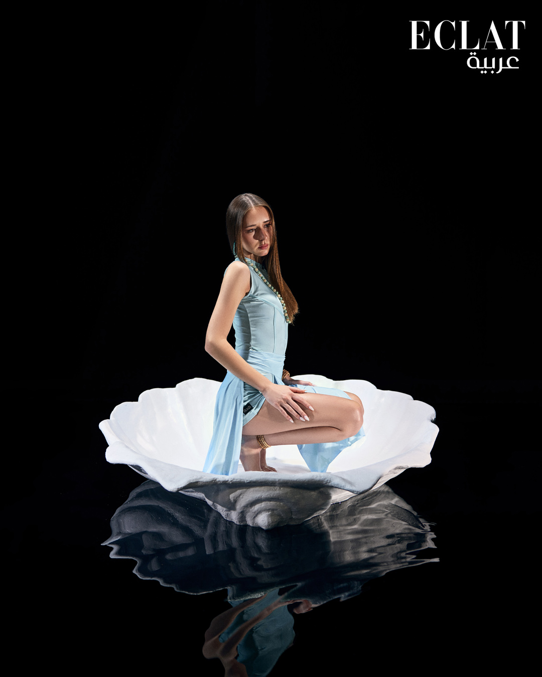 في هذا المشروع، لا شيء عابر أو سطحي. القوقعة البيضاء التي تحتضن العارضات ليست مجرد عنصر ديكوري، بل استعارة مكثفة للذات حين تلجأ إلى الداخل لتعيد تشكيل نفسها. كل عارضة تظهر وكأنها تخرج من هذا الفراغ بخطى متزنة، تستعرض حضورها لا باستعراض جريء، بل بتجلي داخلي عميق. الأرضية العاكسة، كمرآة للمشاعر، والضوء الخافت الذي ينحت الملامح، كلها عناصر تعمل بتناغم لتصنع عالماً لا يشبه شيئاً سوى الصدق. الأزياء بدورها لم تأتِ لتغطي الجسد، بل لتكمله كوسيلة تعبير. الألوان تُروى لا تُقال: الأزرق الباستيلي يمثل البراءة، الأخضر الطحلبي يعكس التوازن، الأسود هو رمز التحوّل، والمرجاني يُعلن عن بداية جديدة. القصات توازن بين الرشاقة والعمق، تبتعد عن الصخب، وتستقر في منطقة خفية بين الفن والوظيفة.