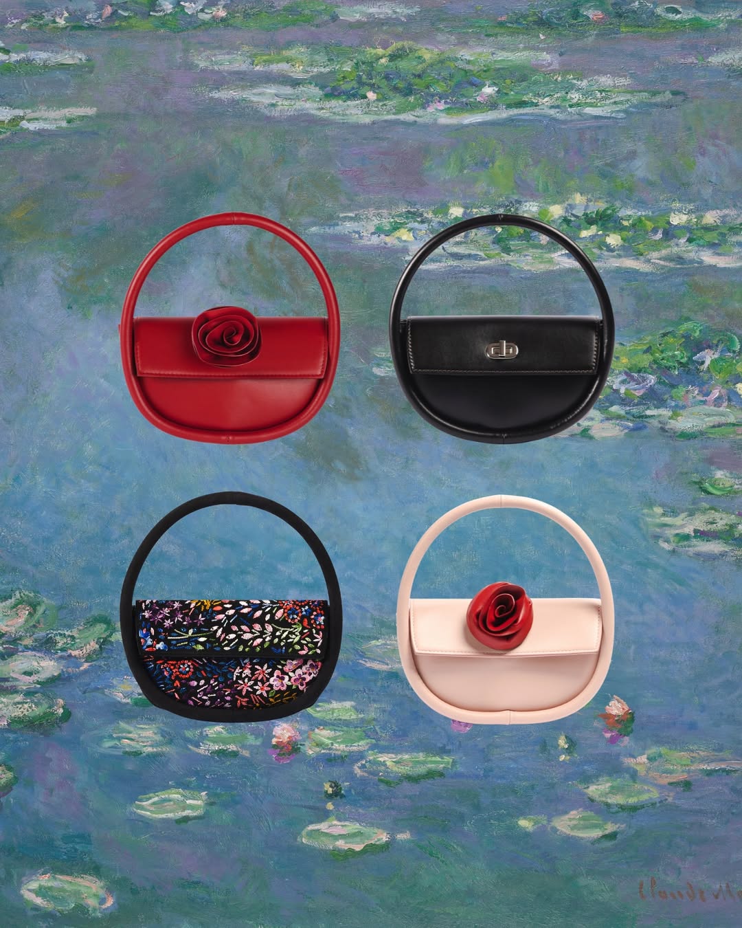 أحد أبرز تصاميم هذه المجموعة هو حقيبة “ميني جاجا – تطريز زهري”، المصنوعة في إيطاليا من جلد الماعز السويدي الأسود الفاخر، والمزدانة بتطريزات زهرية متعددة الألوان مرصعة بزخارف كريستالية دقيقة تضيف لمسة من البريق الرقيق. كما تضم المجموعة حقائب تتوسطها زهرة ورد رومانسية كعنصر محوري للتصميم، تُشكّل كل زهرة منها يدوياً بعناية فائقة، ما يجعل كل حقيبة قطعة فنية فريدة لا تشبه الأخرى.