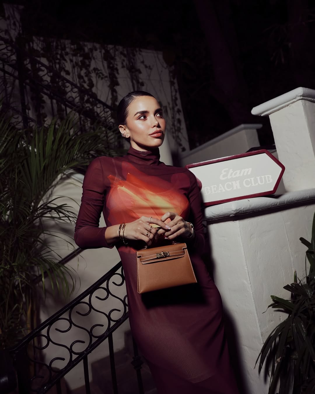 في ليلة ساحلية دافئة، تألقت دانييلا بفستان طويل بلون العنابي الغني، تزيّنه لمسات لونية دافئة تكسر رتابة اللون الواحد. وبين يديها، جاءت الحقيبة البنية الفاتحة من هيرمز لتكون العنصر الذي يربط الإطلالة ببعضها، ويمنحها إحساسًا بالانسجام والاكتمال.