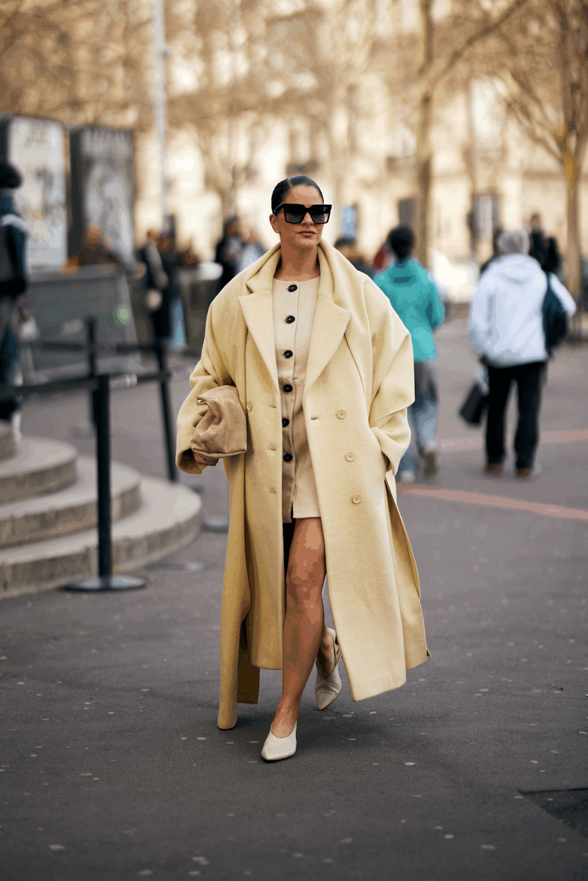 ألوان المعاطف الضخمة هي الأخرى تضيف بعداً مهماً. وبينما تظل الدرجات الكلاسيكية كالأسود والكاميل خياراً مضموناً، فإن ألواناً أكثر دفئاً كالوردي الباستيل، الأبيض الكريمي، الأخضر الزيتوني الناعم، وحتى الدرجات المعدنية كالفضي والذهبي، تمنح إشراقاً وتضيف لمسة أنثوية تمنع الإطلالة من أن تبدو قاسية. ولا يمكن إغفال أهمية الإكسسوارات في هذا السياق، إذ تساعد على إعادة التوازن إلى الإطلالة. حقيبة صغيرة متقاطعة على الجسم تكسر ضخامة المعطف، والأقراط البارزة أو النظارات ذات الإطارات الكبيرة تسحب التركيز نحو الوجه وتمنح لمسة عصرية متجددة.