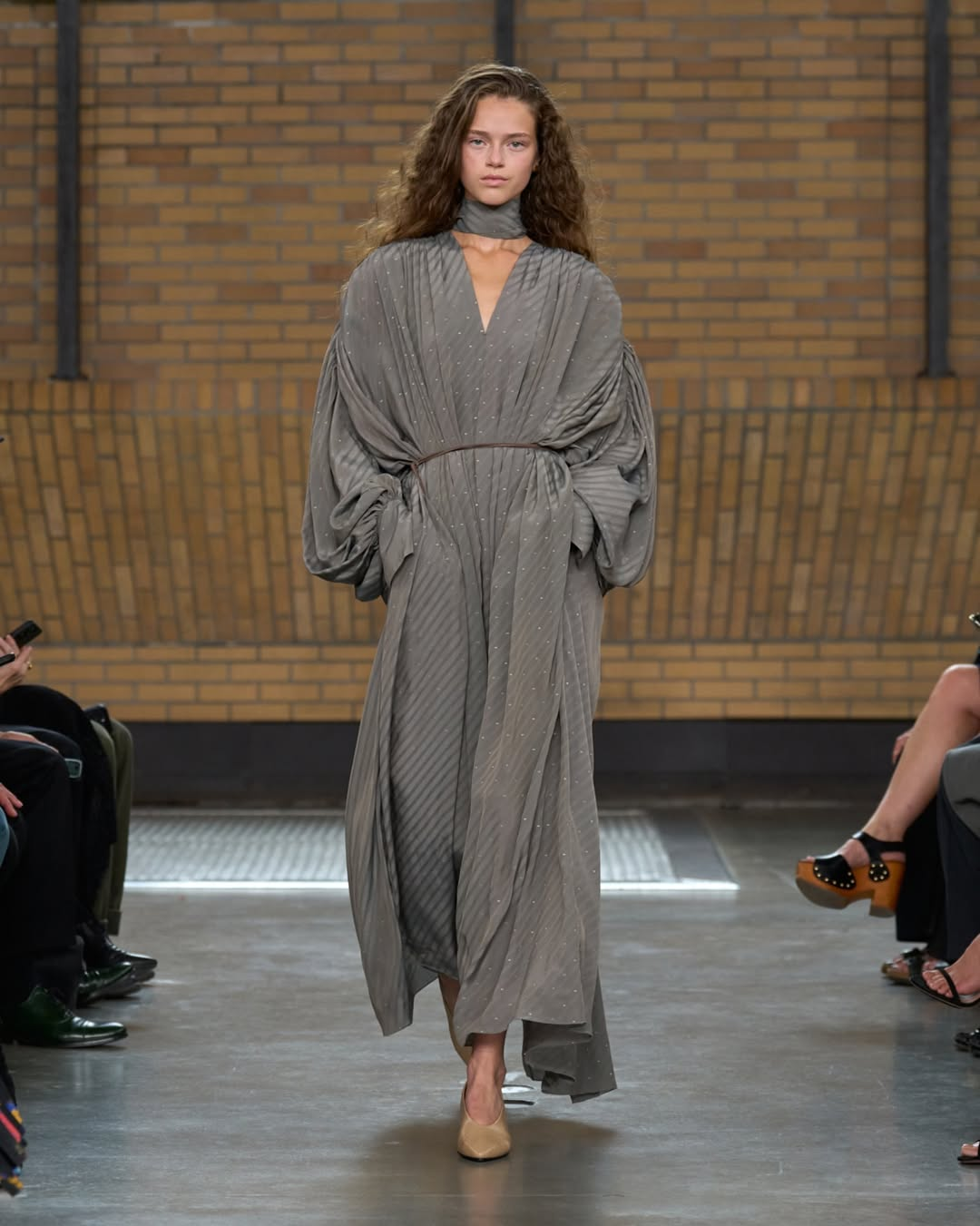 المجموعة الجديدة جاءت لتجسد هذا الفكر من خلال تصاميم تنبض بالقوة والجرأة، إذ استوحت ليوني إلهامها من شخصيات السينما الأميركية التي تنبض بالعفوية والتعبير الحر، لتقدّم طبقات من الأناقة الممزوجة بالبساطة. افتتحت العرض بفساتين على هيئة مريلة من الحرير والقطن، تلتها سترات منسدلة كشفت عن تفاصيل شفافة عكست فكرة اللعب بين الظهور والحميمية، بينما أضافت الأوشحة الناعمة بطبعات أرشيفية لمسة تاريخية أنيقة.